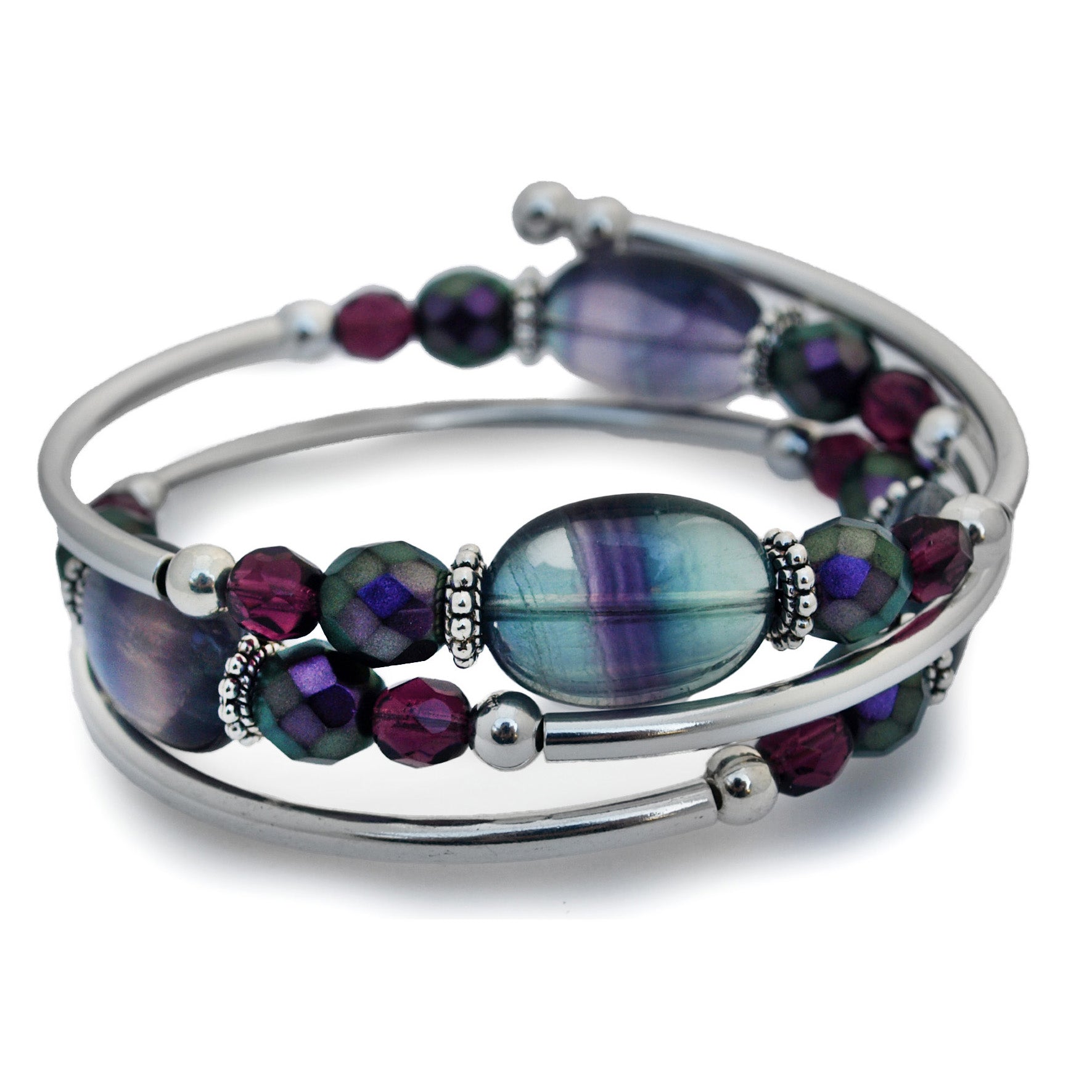 "Get in touch with your inner flower child with our Delphinium bracelet. Featuring stunning fluorite gemstones in beautiful shades of purple, blue, and green, this bracelet will add a pop of color to any outfit. Plus, the playful name is a nod to the whimsical nature of this unique piece. (Flower crown not included!)" All of these components are strung on our Embraceling memory wire which has a measured diameter of 2.25" and accommodates most wrists from 6.5 - 7.5 inches.