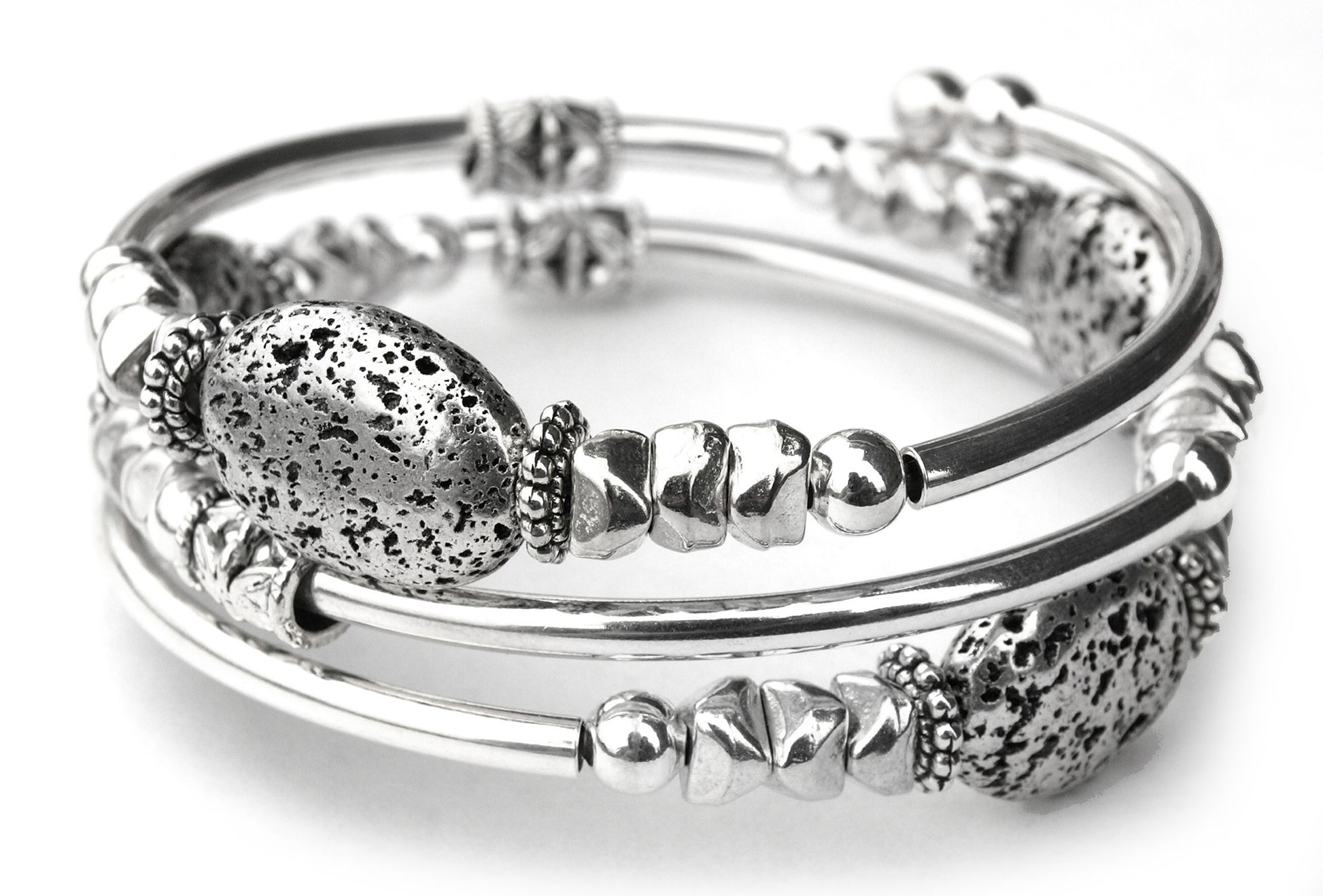 Our metal components are silver plated base metal that purposely does not contain lead, nickel, or cadmium. The beaded components range from glass to pearls, to semi precious gemstones and shells, to wood and nuts.