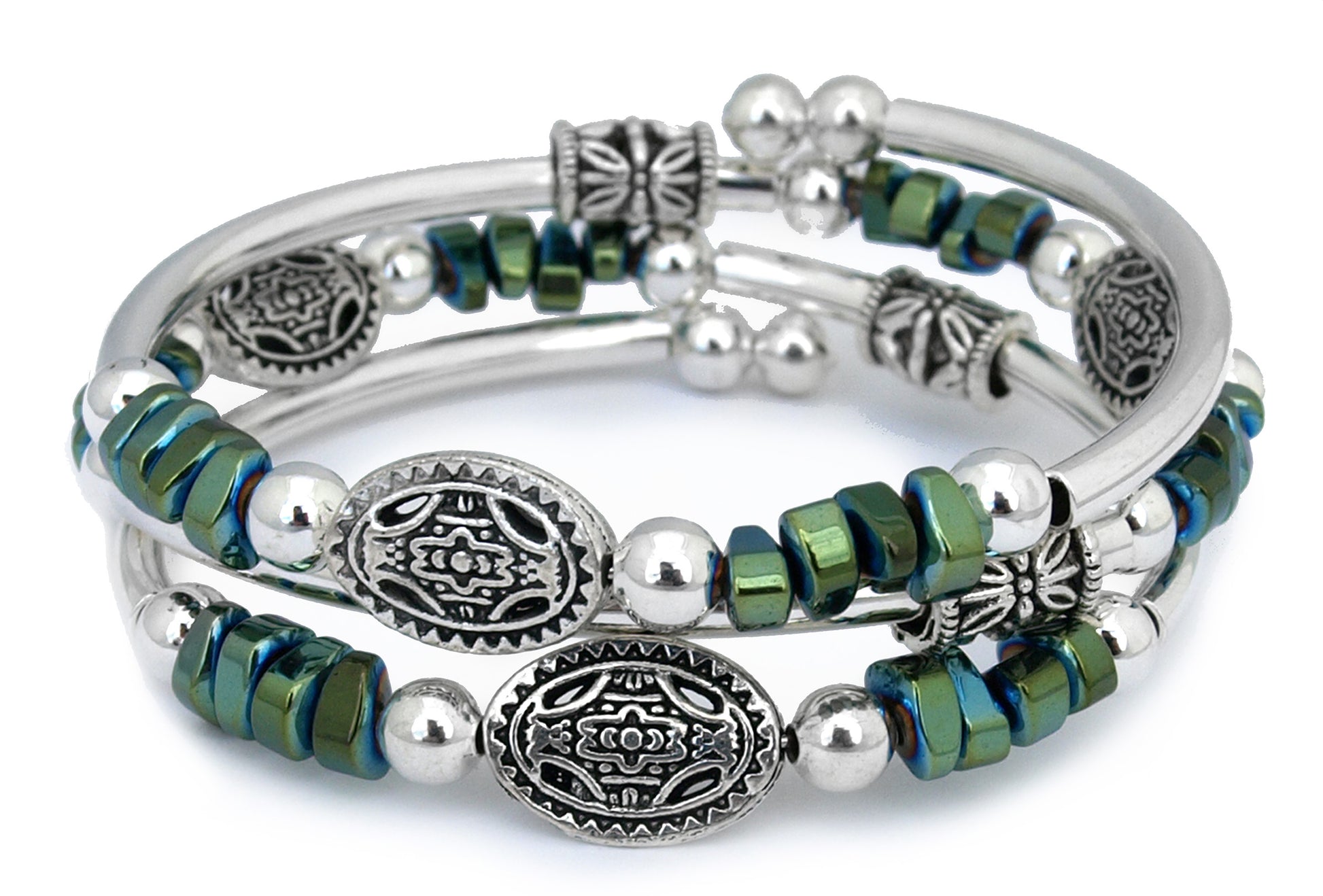 Our metal components are silver plated base metal that purposely does not contain lead, nickel, or cadmium. The beaded components range from glass to pearls, to semi precious gemstones and shells, to wood and nuts.