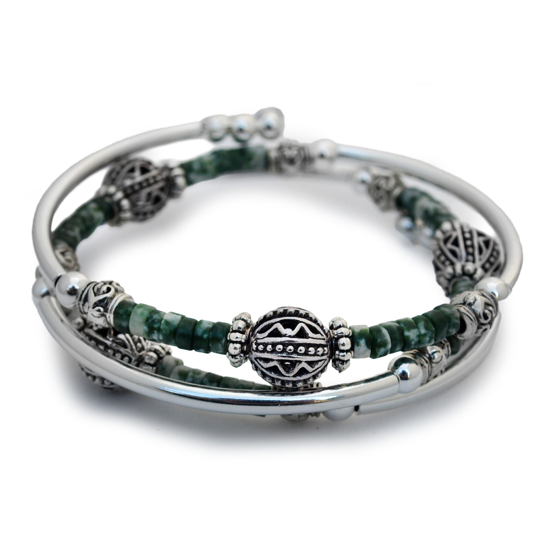 Unleash a touch of natural beauty with our Pothos bracelet. Adorned with earthy green and antique silver accents, this exclusive piece boasts intricate green spot jasper heishi disc beads. Elevate your style with this sophisticated and luxurious accessory.