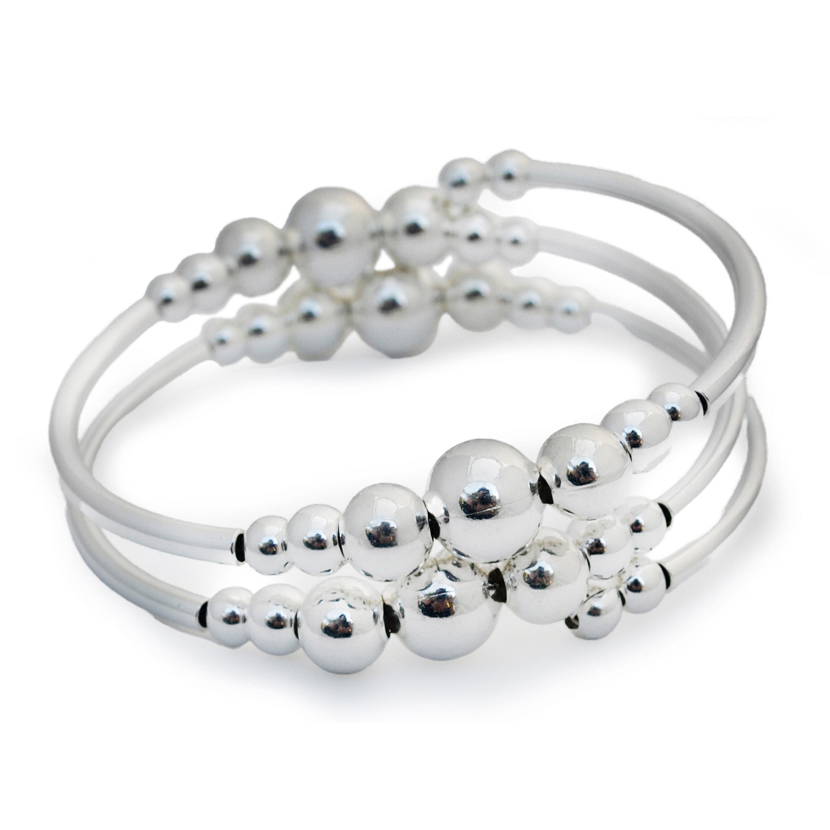 A reference to the gorgeous shining silver Samovars, the pot bellied hot water vessels used in Russia and later around the world, this bracelet is simple but eye catching. Silver plated rounds of increasing and decreasing size are strung in a cascading symphony. All of these components are strung on our Embraceling memory wire which has a measured diameter of 2.25" and accommodates most wrists from 6.5 - 7.5 inches.